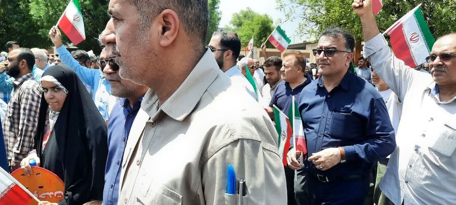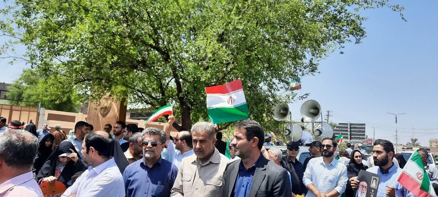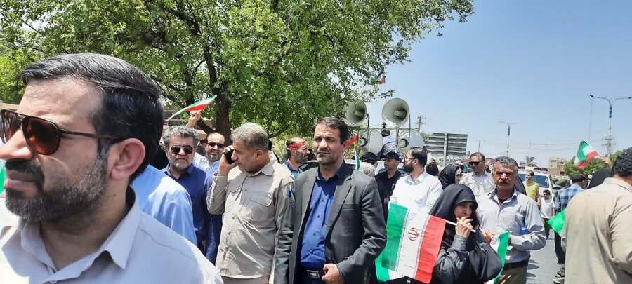 امروز۳۰ خردادماه،مهران کریمیان مدیرکل بهزیستی خوزستان به اتفاق کارکنان این اداره کل همراه با مردم ولایتمدار استان و همپای مردم اهواز با لبیک به ندای مقام معظم رهبری با حضور پرشور در راهپیمایی جمعه همدلی و ایستادگی ضمن ابراز نفرت و انزجار خود از تجاوزات و جنایات رژیم صهیونیستی به خاک میهن عزیز اسلامی با آرمانهای امام (ره)و انقلاب تجدید بیعت کردند.