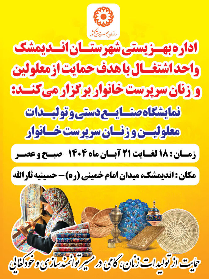 معصومه یزدانی، رئیس اداره بهزیستی شهرستان اندیمشک، از برگزاری نمایشگاه صنایع‌دستی و تولیدات بانوان سرپرست خانوار و افراد دارای معلولیت با هدف حمایت از این اقشار خبر داد.