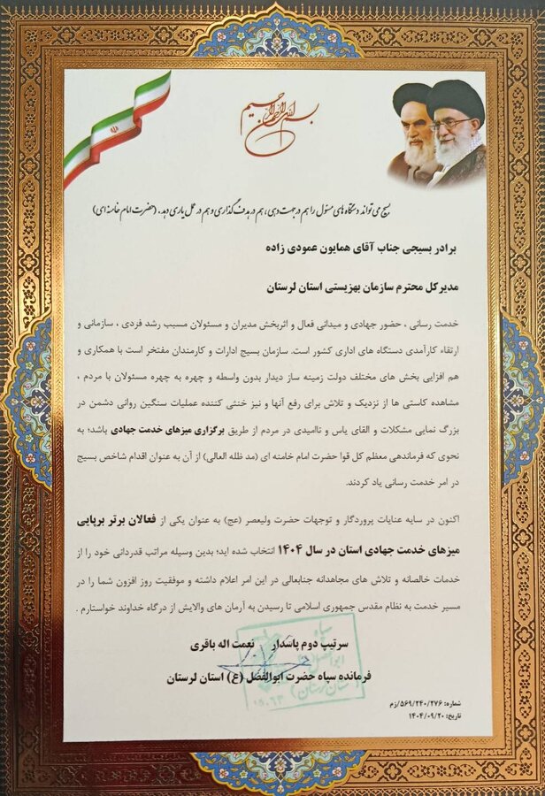 اکنون در سایه عنایات پروردگار و توجهات حضرت ولیعصر (عج) به عنوان یکی از فعالان برتر برپایی میزهای خدمت جهادی استان در سال ۱۴۰۴ انتخاب شده اید؛ بدین وسیله مراتب قدردانی خود را از خدمات خالصانه و تلاشهای مجاهدانه جنابعالی در این امر اعلام داشته و موفقیت روز افزون شما را درمسیرخدمتبه نظام مقدس جمهوری اسلامی تا رسیدن به آرمانهای والایش از درگاه خداوند خواستارم.