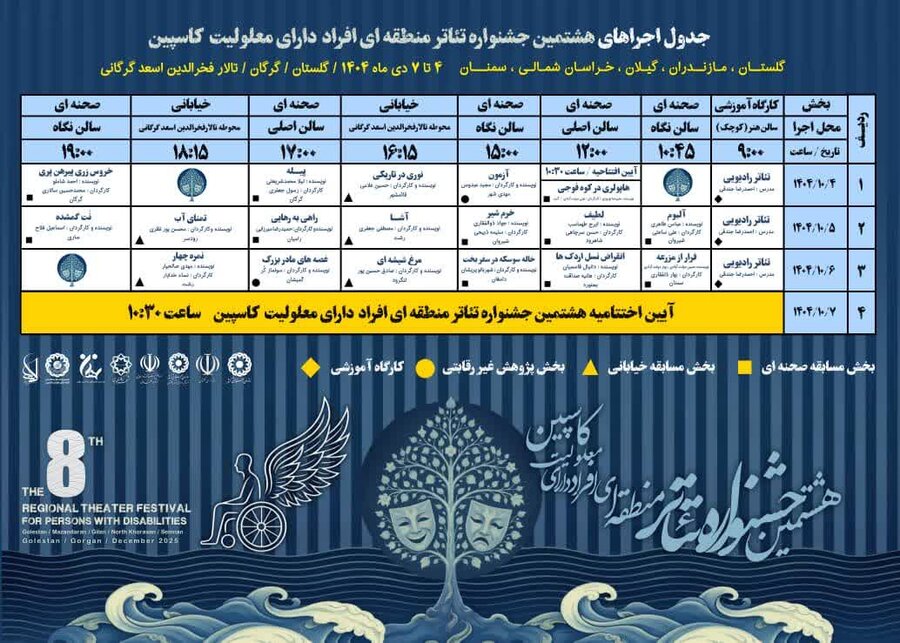 گفتنی است هشتمین جشنواره منطقهای تئاتر افراد دارای معلولیت «کاسپین» با حضور توانخواهان هنرمند از استانهای گلستان، مازندران، گیلان، خراسان شمالی و سمنان، از ۴ تا ۷ دیماه سال جاری به میزبانی استان گلستان برگزار خواهد شد.