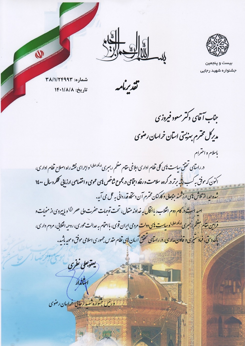 در راستای تحقق سیاست های کلی نظام اداری ابلاغی مقام معظم رهبری(مدظله العالی) و اجرای نقشه راه اصلاح نظام اداری، اکنون که موفق به کسب رتبه برتر در گروه سلامت و رفاه اجتماعی در مجموع شاخص های عمومی و اختصاصی ارزیابی عملکرد سال 1400 شده اید، از تلاش های ارزشمند جنابعالی و کارکنان محترم آن دستگاه قدردانی به عمل می آید.