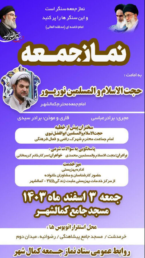 به گزارش روابط عمومی اداره کل بهزیستی استان البرز؛روز جمعه سوم اسفندماه " اعظم امین پور" مسئول مرکز مثبت زندگی کد ۲۱۴۵۹ از برپایی میزخدمت در محل مصلّی مسجد جامع کمالشهر خبر داد.وی پیش از خطبه های نماز جمعه با حضور در محل میز خدمت ضمن تشریح خدمات بهزیستی برای مسئولین بازدید کننده،با جمعی از نمازگزاران از جمله مددجویان و جامعه هدف بهزیستی به صورت چهره به چهره دیدار و گفتگو کرده و پیگیری مشکلات و درخواستهای مراجعین را در دستور کار قرار داد.