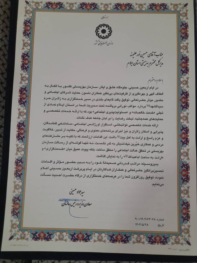 به گزارش روابط عمومی بهزیستی ایلام، در بخشی از این لوح عنوان شده: "مواکب نورانی برپا شده تحت مدیریت شما در استان ایلام نمادی از تجلی "خدمت خالصانه" و "مسئولیت پذیری اجتماعی" بود که با ارائه خدمات تخصصی و حمایت های همه جانبه لبخند رضایت را بر لبان جامعه هدف نشاند.