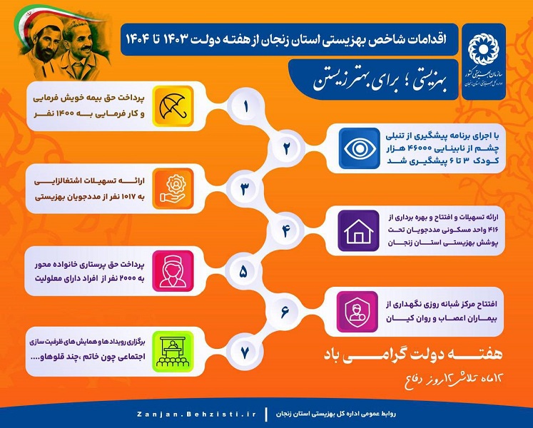 ارائه تسهیلات، افتتاح و بهره برداری از ۴۱۶ واحد مسکن مددجویان تحت پوشش، پرداخت حق بیمه خویش فرمایی و کارفرمایی به ۱۴۰۰ نفر، ارائه تسهیلات اشتغالزایی به یک هزار و ۱۷ نفر، پرداخت حق پرستاری خانواده محور به ۲ هزار نفر از افراد دارای معلولیت، برگزاری رویدادها و همایش های ظرفیت سازی اجتماعی چون خاتم، چندقلوها و...، اجرای برنامه پیشگیری از تنبلی چشم و غربالگری بینایی ۴۶ هزار کودک ۳تا ۶ سال از اقدامات شاخص بهزیستی استان زنجان از هفته دولت سال گذشته تاکنون است.