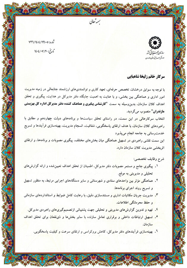 با توجه به سوابق درخشان، تخصص حرفه‌ای، تعهد کاری و توانمندی‌های ارزشمند جنابعالی در زمینه مدیریت امور اداری و هماهنگی بین بخشی، و با عنایت به اهمیت جایگاه دفتر مدیرکل در هدایت، پیگیری و تحقق اهداف کلان سازمان، بدین‌وسیله به سمت "کارشناس پیگیری و هماهنگ‌کننده دفتر مدیرکل اداره کل بهزیستی مازندران" منصوب می‌گردید.