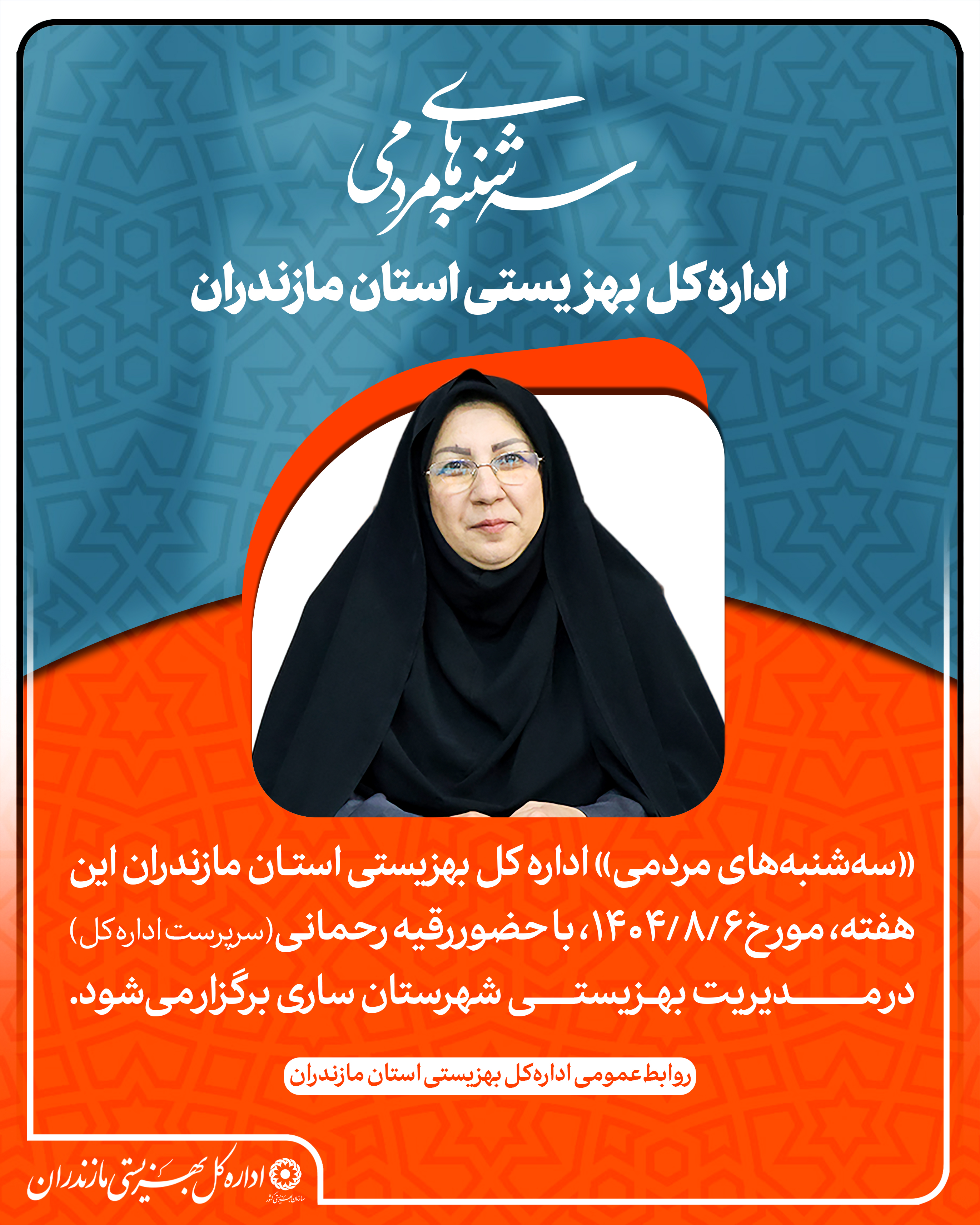 به گزارش روابط عمومی اداره کل بهزیستی مازندران؛ «سه‌شنبه‌های مردمی» اداره کل بهزیستی استان مازندران این هفته، مورخ ۱۴۰۴/۸/۶، با حضور رقیه رحمانی، سرپرست اداره کل بهزیستی استان مازندران در مدیریت بهزیستی شهرستان ساری برگزار می‌شود.