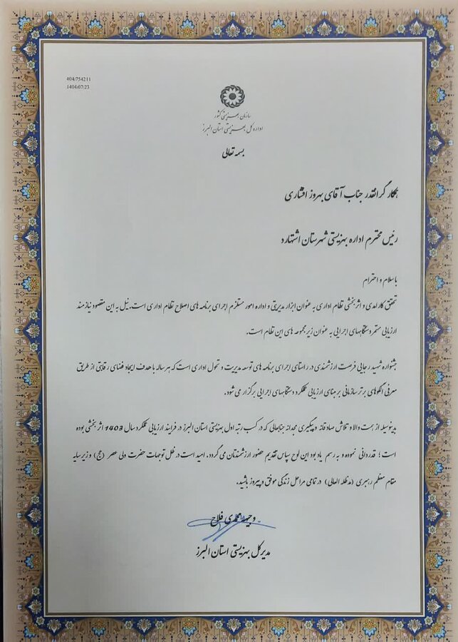 به گزارش روابط عمومی اداره کل بهزیستی استان البرز؛روز یکشنبه ۲۵ آبان ماه "مریم حسینی" مسئول دفتر مدیریت عملکرد و پاسخگویی به شکایات بهزیستی استان البرز با "بهروزافشاری" رئیس بهزیستی شهرستان اشتهارد دیدار و لوح تقدیر مدیرکل محترم بهزیستی استان البرز به پاس کسب رتبه نخست جشنواره شهید رجایی در ارزیابی عملکرد را به وی اهداء کرد.