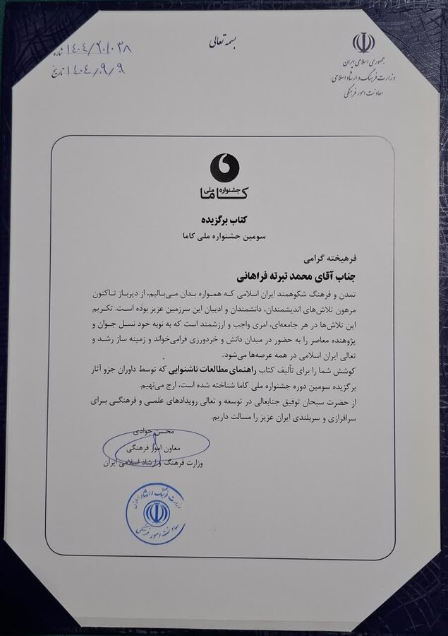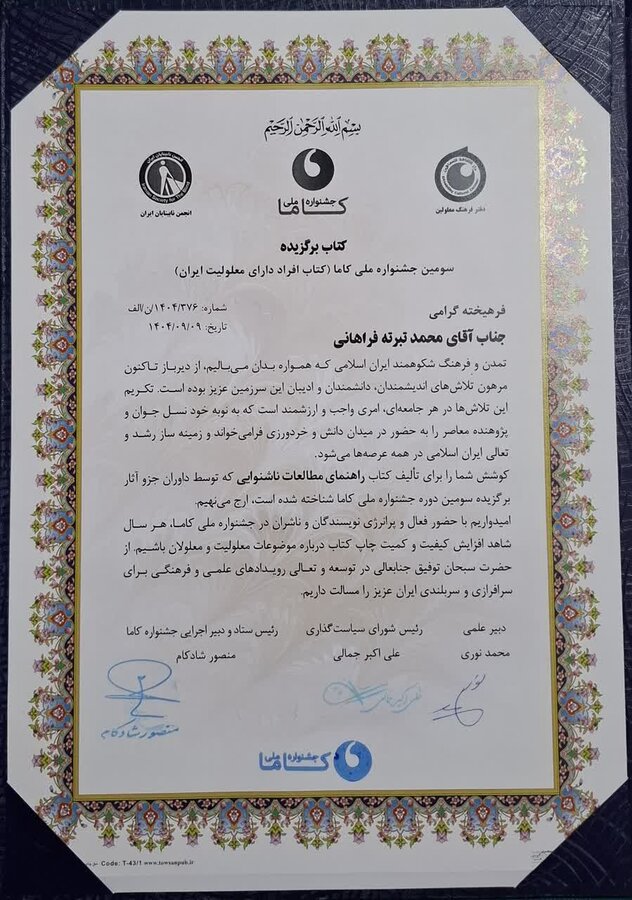 طبق داوری سومین جشنواره ملی کاما (کتاب افراد دارای معلولیت ایران) کتاب راهنمای مطالعات ناشنوایی، تألیف محمد نوری و محمد تبرتهفراهانی بعنوان اثر برگزیده رونمائی شد.