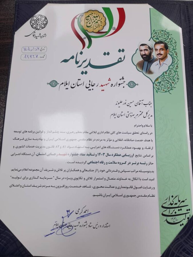 اداره‌ کل بهزیستی استان ایلام در اختتامیه بیست و هشتمین جشنواره شهید رجایی بر اساس نتایج ارزیابی عملکرد سال ۱۴۰۳ و تایید ستاد جشنواره موفق به کسب رتبه برتر در گروه سلامت و رفاه اجتماعی شد