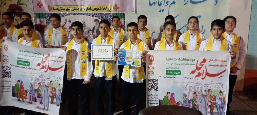 به گزارش روابط عمومی اداره بهزیستی شهرستان فسا ، در راستای اجرای پویش سراسری سلام محله با " *رویکرد مشارکت اهالی محل برای بهتر زیستن در قالب هوای محله ات را داشته باش* " در ۱۴ بهمن ماه ۱۴۰۴ همزمان با ۲۵۰۰ مرکز مثبت در کشور ، ادامه فعالیت ها و اقدامات مختلف مراکز خدمات بهزیستی مثبت زندگی تحت نظارت اداره بهزیستی فسا در سطح شهرستان عبارت است از : مرکز ۳۴۲: انجام مشاوره به مددجویان در جریان پویش به مناسبت هفته جوان تمامی مراکز مثبت : توزیع شیر، شکلات ، شیرینی و کیک در بین مردم و مراجعین به مناسبت اعیاد شعبانیه مرکز ۶۹۶۰ :حضور بخشدار و مسئولین محلی و مسئول نمایندگی بهزیستی ، خیرین و سایر مردم در کانون مثبت زندگی کد ۶۹۶۰ مستقر در زاهدشهر و ثبت نام در این پویش و برپایی ایستگاه سلامت و توزیع ۳۰ بسته گوشت قرمز گوسفندی و اهدای هدیه به جوانان از گروه های هدف این مرکز به مناسبت میلاد امام زمان(عج) و اعیاد شعبانیه و هفته جوان مراکز مثبت کدهای ۱۹۱۱ و ۳۹۲ : توزیع کیک میلاد امام زمان(عج) و شیرینی و شکلات در بین مردم ، اجرای سرود توسط دانش آموزان مدرسه پسرانه شاهد ودختران ، برپایی میز خطاطی و نقاشی یکی ازجوانان گروه هدف به مناسبت هفته جوان در جلوی مصلی نمازجمعه فسا کانون برگزار کننده پویش سلام محله مراکز مثبت زندگی کدهای ۳۹۲ و ۱۹۱۱