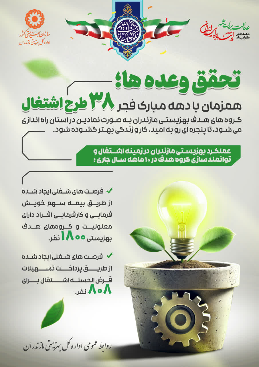 همزمان با دهه مبارک فجر ۳۸ طرح اشتغال گروه های هدف بهزیستی مازندران به صورت نمادین در استان راه اندازی می شود، تا پنجره ای رو به امید، کار و زندگی بهتر گشوده شود.