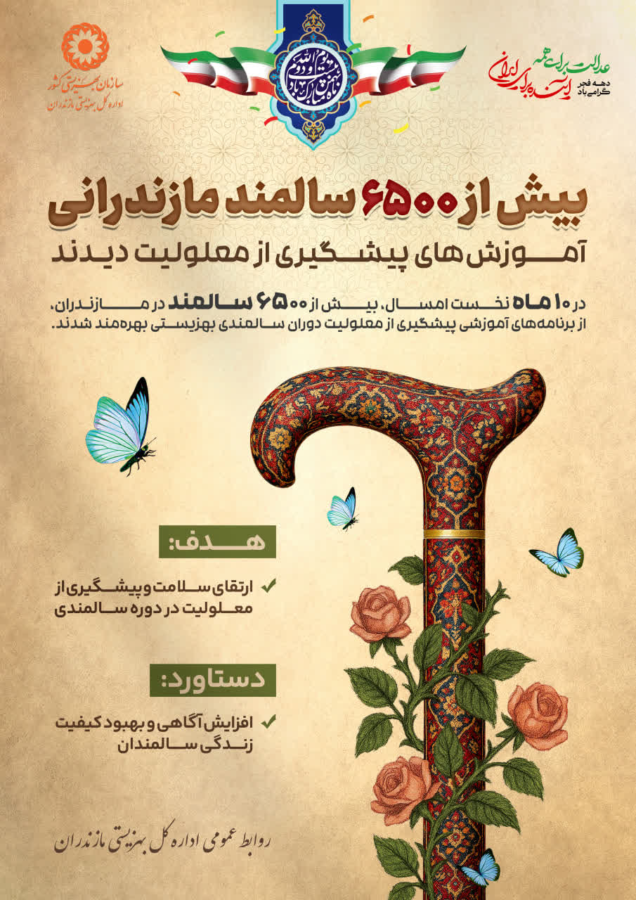 در ۱۰ ماه نخست امسال، بیش از ۶۵۰۰ سالمند در مازندران، از برنامه‌های آموزشی پیشگیری از معلولیت دوران سالمندی بهزیستی بهره‌مند شدند.