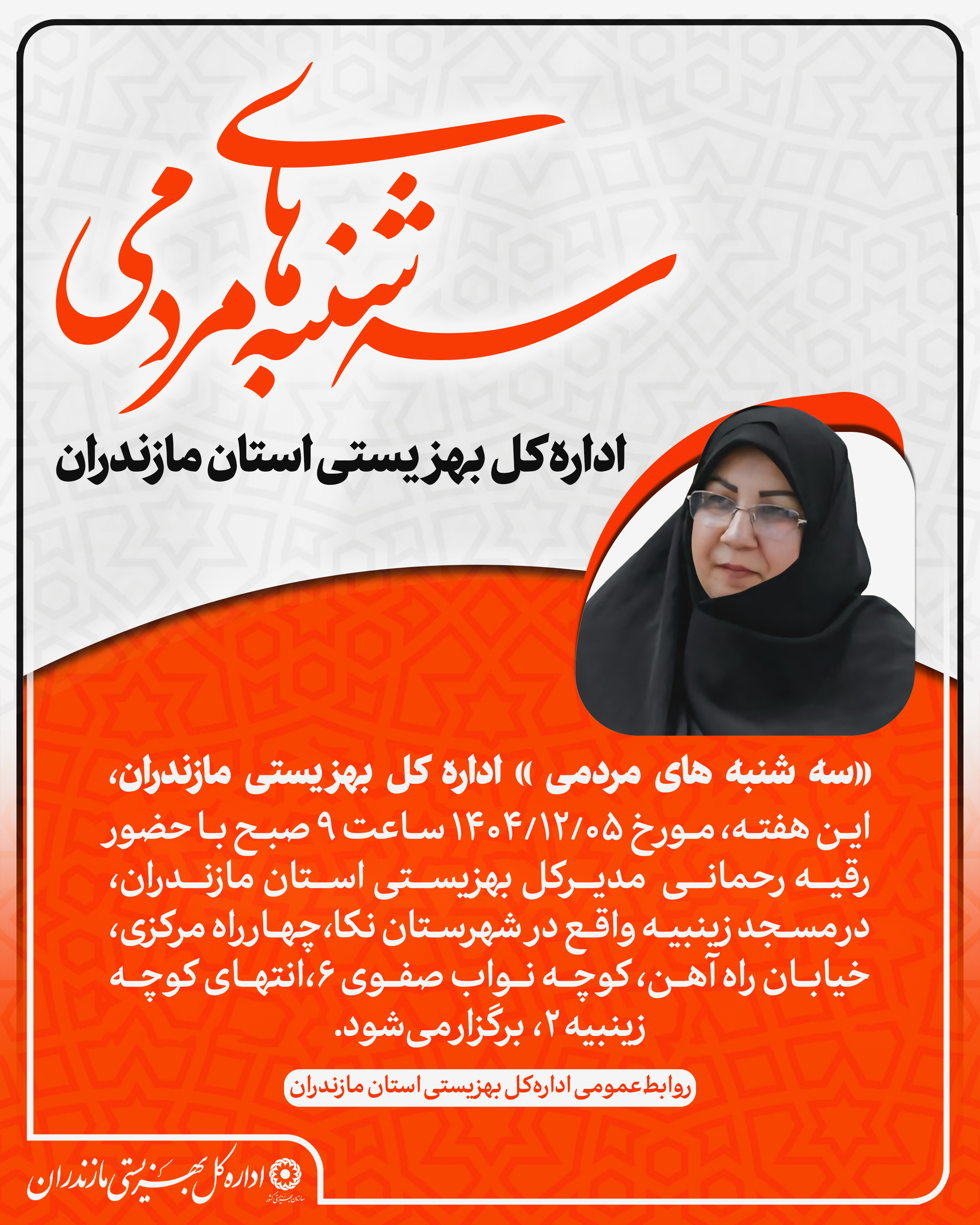 به گزارش روابط عمومی اداره کل بهزیستی مازندران؛ «سهشنبههای مردمی» اداره کل بهزیستی استان مازندران این هفته، ساعت ۹ صبح مورخ ۱۴۰۴/۱۲/۰۵، با حضور رقیه رحمانی، مدیرکل بهزیستی استان مازندران در مسجد زینبیه واقع در شهرستان نکا، چهارراه مرکزی، خیابان راه آهن، کوچه نواب صفوی ۶، انتهای کوچه زینبیه ۲ برگزار میشود.